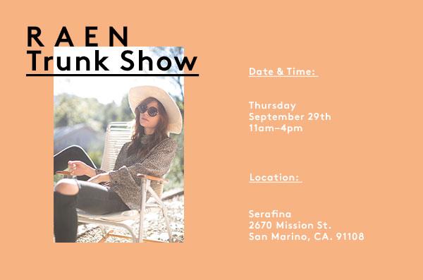 Come visit us at Serafina for the RAEN Trunk Show featuring Fall 2016. Enjoy some sips and snacks, shop our latest collections and receive a special promotion on all in-store RAEN purchases during the trunk show!